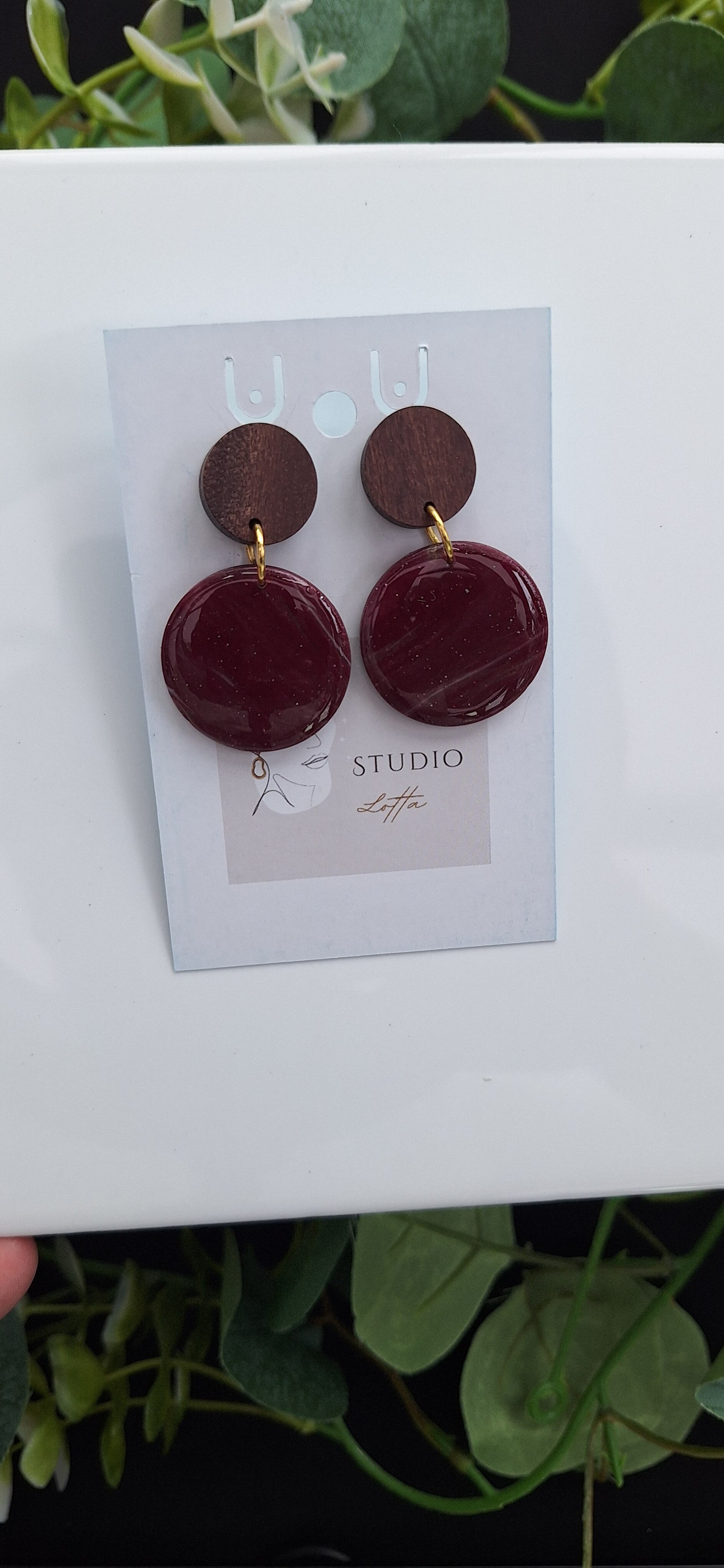 Bordeaux oorbellen met vlammetjes en houten steker.