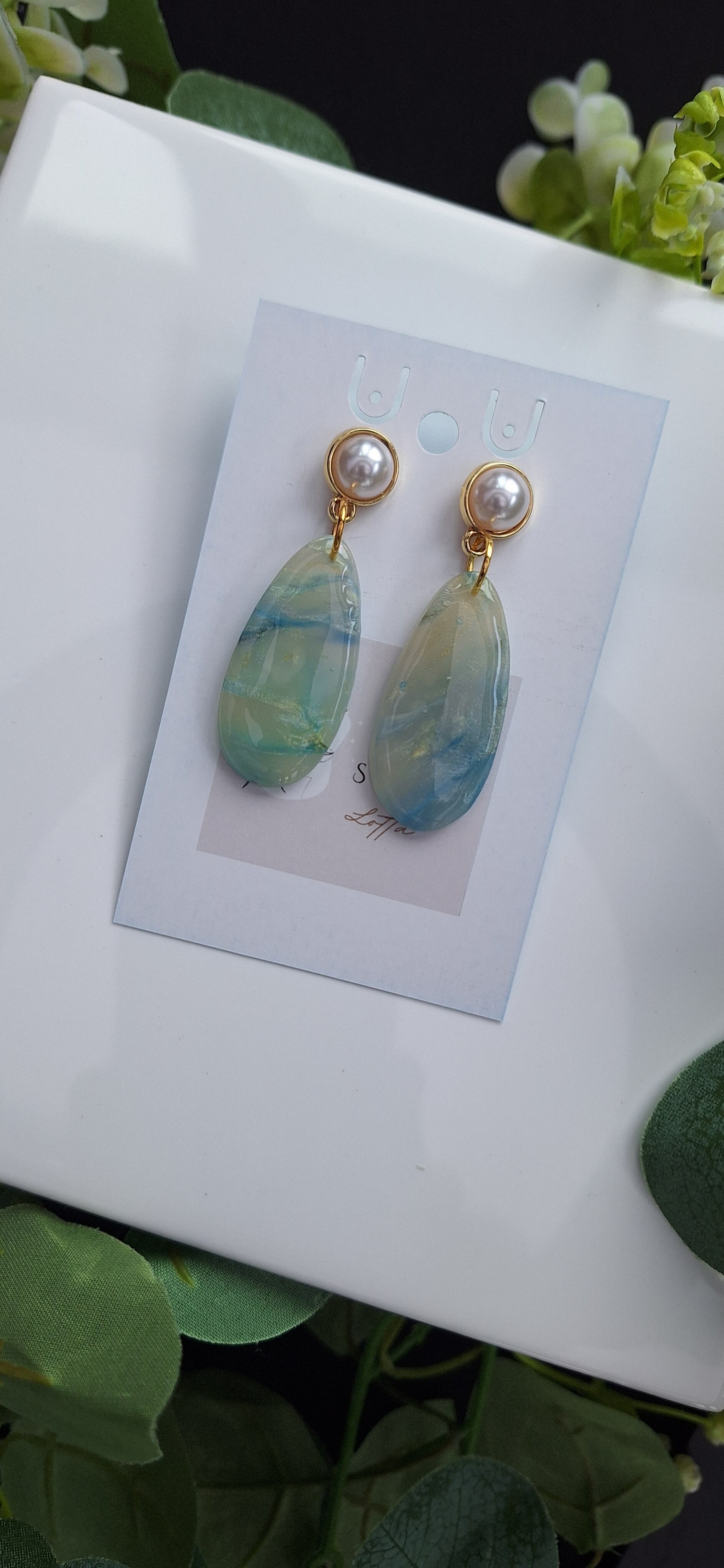 Zelfgemaakte oorbellen uit polymeerklei: ovale lichtblauwe translucent met parel