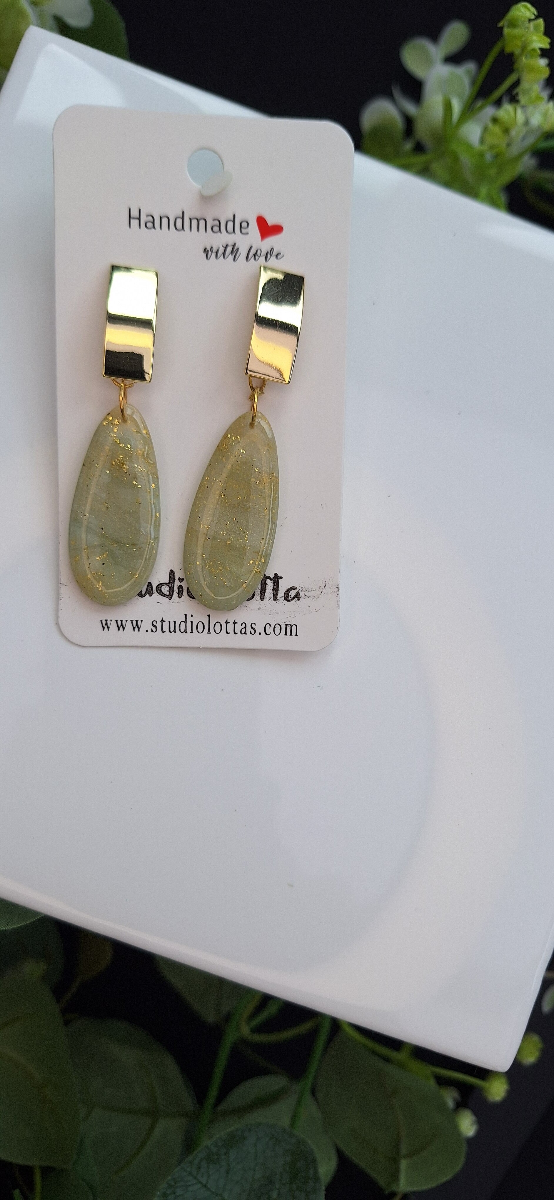 Zelfgemaakte oorbellen uit polymeerklei: lichtgroen-blauwe oorbellen met goudkleurige langwerpige steker