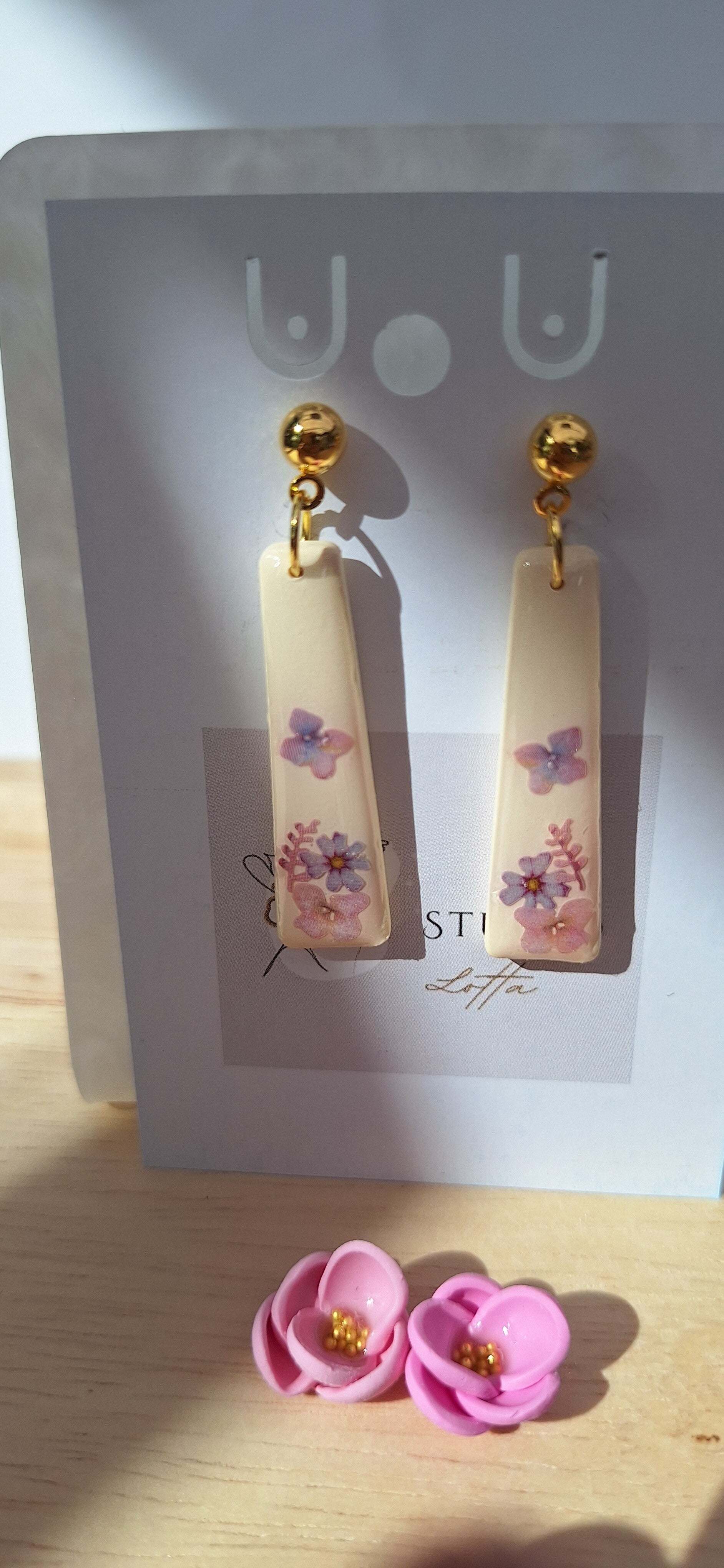 Handgemaakte oorbellen uit polymeerklei: ivoor met bloemetjes en bolletjes steker